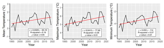 | Minimum Temperature | Winter | y = 0.0915x − 196 | R2 = 0.14 | * |