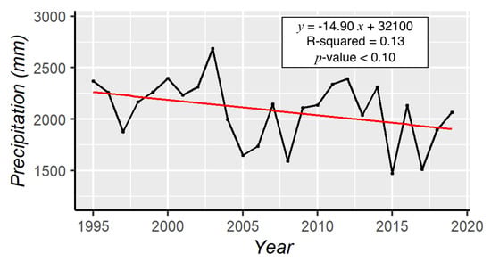 | Precipitation | Winter | y = −1.49x + 3030 | R2 = 0.06 | ns |