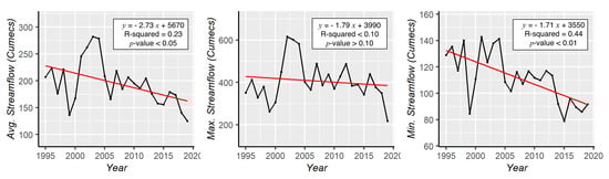 | Minimum Streamflow | Winter | y = 0.0779x − 115 | R2 = 0.01 | ns |