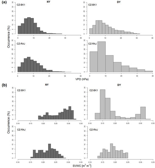 Histogram showing the frequency of occurrence of (a) vapour pressure deficit (VPD) and (b) soil volumetric water content (SVWC) conditions during May–September between years with normal conditions (dark colour) and drought stress (grey colour) in CZ-BK1 and CZ-RAJ.