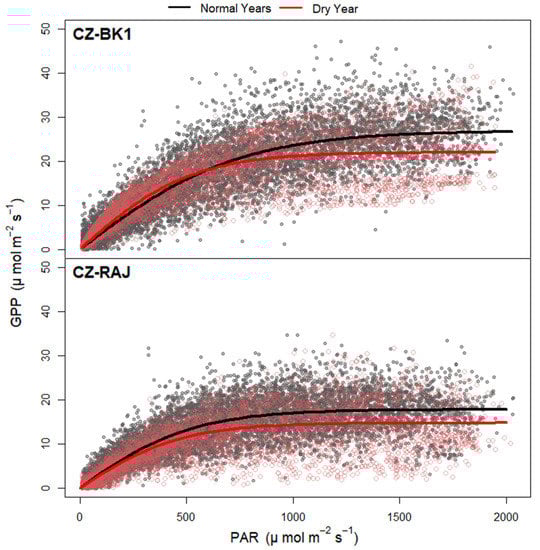 Response of gross primary productions to photosynthetically active radiation during the years with normal conditions (black) and affected by drought stress (red) in CZ-BK1 and CZ-RAJ. The half-hourly GPP values (points) were fitted using the logistic sigmoid light response curves (lines).