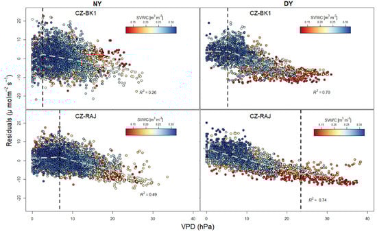 Generally, the relationship between the residuals and changes in VPD and SVWC revealed a biphasic response to drought, except for the DY period in CZ-RAJ in Figure 3. All the breakpoints from the piecewise regression were found to be statistically significant (Table 7). However, steeper slopes after the VPD breakpoint values from the initial slope were mostly observed for both DY and NY periods in CZ-RAJ and only for DY period in CZ-BK1. This shows that during all the years under study, GPP decreased at a faster rate after the breakpoint in CZ-RAJ than in CZ-BK1, except for the DY period when there was a significant decline in GPP at a faster rate after the breakpoint across both sites.
