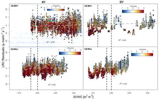 Relationship between the light response curve (LRC) residuals of the light response curve of gross primary production and the soil volumetric water content (SVWC) at the spruce forest sites in CZ-BK1 and CZ-RAJ for the normal (NY) and dry years (DY). Red represents high VPD conditions and blue shows low VPD conditions. The grey dashed lines represent the piecewise regression model slope, whereas the black dashed lines show the breakpoint values.