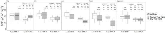 Monthly averages of daily sums of gross primary productivity (GPP) for May–September of the normal years (NY) and dry year (DY) in CZ-BK1 and CZ-RAJ. The tables within the figure represent the mean monthly vapour pressure deficit (VPD) and soil volumetric water content (SVWC) values from May to September for each forest station.