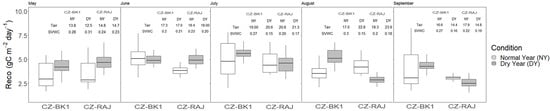 Monthly averages of daily sums of ecosystem respiration (Reco) for May–September of the normal years (NY) and dry year (DY) in CZ-BK1 and CZ-RAJ. The tables within the figure represent the mean monthly air temperature (Tair) and soil volumetric water content (SVWC) values from May to September for each forest station.