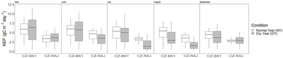 Monthly averages of daily sums of NEP for May–September of the normal years (NY) and dry year (DY) in CZ-BK1 and CZ-RAJ.
