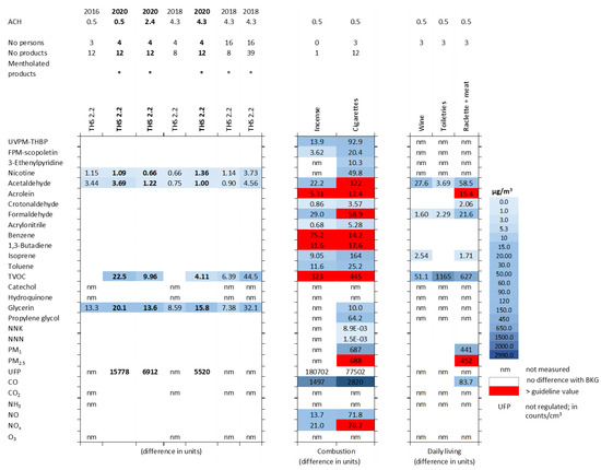 - Höllbacher, E.; Ters, T.; Rieder-Gradinger, C.; Srebotnik, E. Emissions of indoor air pollutants from six user scenarios in a model room. Atmos. Environ. 2017, 150, 389–394. [Google Scholar] [CrossRef]