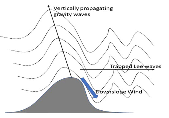 Formation of lee gravity waves is a common feature in atmospheric fluid dynamics. Lee waves form due to the vertical oscillation of the air mass, after the flow has been vertically perturbed to overcome a mountain ridge. The existence of such waves is often evident by the formation of lenticular clouds at the lee side of the mountain and by the generation of severe downslope winds (Figure 1). Considering Newton’s second law, the balance at the vertical direction takes the form of Equation (1), where z’ is the mean elevation of the air mass parcel, z is the vertical elevation, g is the gravitational constant and ρ is the density of the air mass. Assuming a vertically stabilized density field with denser fluid laying below the lighter ones and a constant rate of density change in the vertical , Equation (1) obtains a solution in the wave form of Equation (2). This solution shows that the air mass parcel is oscillating in the vertical while traveling horizontally. Parameters A and B in Equation (2) are constants, and is the classical Brunt-Vaisala frequency (Equation (3)) where θ is the potential temperature (e.g., [13]). In a stable air mass where N2 > 0 a vertically perturbed air parcel will have the tendency to come back to its equilibrium level, and the frequency of the oscillation is given by N. In an unstable air mass, N2 < 0 and the vertically perturbed air parcel will move away from the equilibrium level (i.e., free convection). Favorable tuning between atmospheric and topographic properties can lead to the formation of downslope windstorms analogous to a hydraulic jump when the flow over a mountain transitions from subcritical to supercritical, or when vertically-propagating mountain waves undergo partial reflection at wave-induced critical layers (wave breaking) or atmospheric critical layers (e.g., wind shear regimes) [14,15,16,17,18].