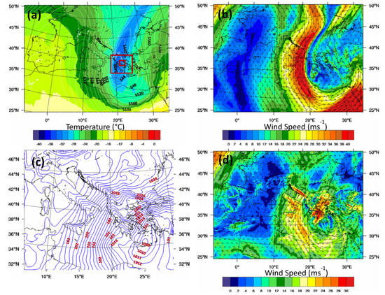 (a) Geopotential height (line contours every 20 m) and temperature (color scale in °C) at 500 mb, 13 February 2019, 18:00 UTC; (b) Wind speed and direction at 500 mb (m s−1), 14 February 2019, 00:00 UTC; (c) Sea level pressure (every 1 mb), 14 February 2019, 00:00 UTC (zoom from grid1) and (d) Wind speed and direction at 850 mb (m s−1), 14 February 2019, 00:00 UTC, as simulated at the external model domain. The nesting structure is also shown by the red rectangulars in Figure 2a.