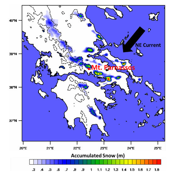 At synoptic scale, the main atmospheric disturbance is found to be an eastward propagating trough that is evident by the geopotential height and temperature field at 500 mb in Figure 2a, on 13 February 2019, 18:00. The trough is deepening over Greece with geopotential heights reaching 5400 m and temperatures falling below −36 °C. The wind flow at 500 mb is dominated by the trough circulation, and as seen by the wind field on 14 February 2019, 00:00 UTC in Figure 2b, the wind direction over central Greece at this tropospheric level is SSE. Cyclogenesis is evident at the lower tropospheric levels on 14 February 2019, 00:00 UTC, as seen by the sea level pressure contours in Figure 2c. The center of the surface depression is found over the southern parts of Aegean Sea, accompanied by the “packing” of isobars along the SW–NE axis over the Aegean. The combination of this low-pressure system with the higher sea- level pressure over central Europe results in the generation of a strong northeast wind flow channeling through the Aegean with maximum speeds on 14 February 2019, 00:00 UTC exceeding 30 m s−1 at 850 mb (Figure 2d). The acceleration of wind speed that is evident in this plot over mainland Greece, the Aegean islands and the Dalmatian Alps, indicates the interaction between the wind flow and the orography. As will be explained in the following sections, backing of the wind from SSE at 500 mb to NNE at 850 mb over the area of interest plays an important role for the generation of the “Katevatos” downslope flow. Furthermore, the advected NE air masses are enriched with vapor from the Aegean Sea, and thus, they become lighter and more unstable. As seen by the total modeled accumulated snowfall from all runs at the intermediate model domain (Figure 3), the northeast current is associated with heavy snowfall over central Greece. This is mostly evident for the upwind slopes that are perpendicular to the incoming flow, due to mechanical convection when the advected air masses reach the inland mountain ridges. As seen also in Figure 3, the greater area of Mt. Parnassos is one of the most affected by snowfall areas in mainland Greece in our simulations.