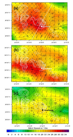 Earlier studies on the effects of asymmetric mountain slopes to the generation of downslope windstorms have shown that the mountain shape has a peculiar influence on gravity wave structure and that the wave drags are significantly enhanced for mountain ridges with gentle windward slopes and steeper lee slopes [29,30,31,32]. A steeper lee orography is also the case for Mt. Parnassos as can be seen by the topographic contour lines in Figure 4 and by the cross-section plots (e.g., Figure 6). The steeper lee slope acts as an additional enhancing factor to the windstorm force. Obviously, the flow domain is in fact more complex, especially at areas of cloud formation; however, our results are in line with the idealized theoretical concepts for the formation of lee gravity waves and downslopes. Favorable tuning between the critical layer height, mountain top heights and flow properties (wind speed and shear, stability) can result in partial reflection of waves towards the ground and generation of downslope winds [14,15,16]. Such conditions are evident in Figure 6a and Figure 7a where the abrupt wind shift at about 6–7 km acts as critical surface for wave reflection.
