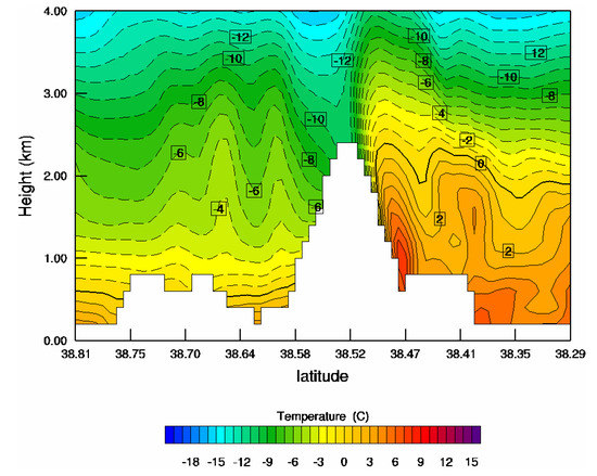 Modeled temperature in °C from the inner 1 × 1 km domain, along the cross-section shown in Figure 4a, 14 February 2019, 02:00 UTC.