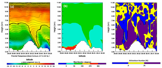 (a) Potential temperature (line contours in K) and meridional wind speed (color scale in m s−1). The bold black line is the zero speed isotach; (b) Wind direction (degrees), (c) Richardson Number (Ri), simulated on 13 February 2019, 21:00 UTC.