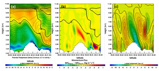 (a) Potential temperature (line contours in K) and meridional wind speed (color scale in m s−1) on 14 February 2019, 02:00 UTC. The bold black line is the zero isotach for the v wind component; (b) Momentum flux difference MFy (03:00 UTC)—MFy (02:00 UTC) (kg m−1 s−2) and zero v isotach; (c) Vertical (w) wind component (m s−1), 14 February 2019, 02:00 UTC. The bold black line is the zero isotach for the w wind component.