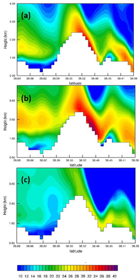 Horizontal wind speed (m s−1) at the time of the maximum speed occurrence for each simulation: (a) 14 February 2019, 03:00 UTC; (b) 6 January 2020, 16:00 UTC; (c) 15 February 2021, 18:00 UTC.