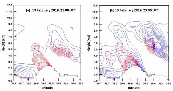 Modeled condensates mixing ratio: liquid (red contours every 0.04 g kg−1 starting from 0.04 g kg−1) and frozen (blue contours every 5.E-4 g kg−1 starting at 5.E-4 g kg−1): (a) 13 February 2019, 12:00 UTC; (b) 13 February 2019, 23:00 UTC.