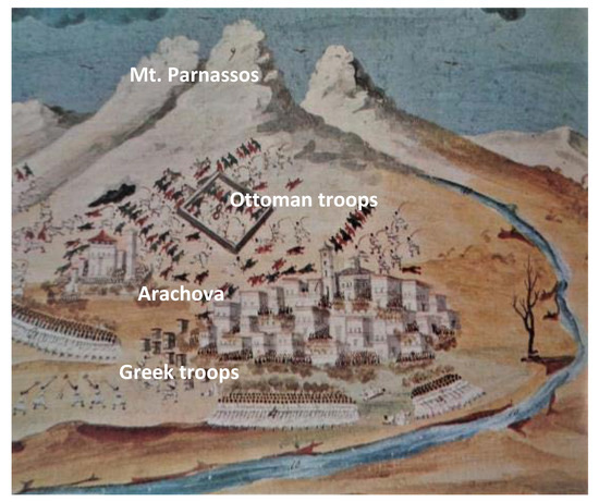 After analyzing the current events, we can postulate that the weather patterns shown in this study are responsible for the “Katevatos” event that was recorded during the battle of Arachova in November of 1826 between Greek and Ottoman forces. As described in the historical sources [1,2,3,4,5], this critical battle took place under weather conditions similar to the ones found in this study. The prevalence of the Greek forces in the battle of Arachova was crucial for the fate of the Greek revolution, and this conflict had a major contribution to the final stages of the Greek–Ottoman war. The battle lasted for 5–6 days and ended on 24 November 1826. The Ottoman forces, leaded by general Moustambeis, were trapped at the elevated slopes of Mt. Parnassos, while the Greek forces of general Karaiskakis remained protected from the extreme weather at lower elevations inside Arachova (see Figure 10). When the Ottomans tried to escape through the mountain passages, the appearance of “Katevatos” made their attempt impossible and resulted in heavy casualties, practically eliminating their forces [1,2,3,4]. The impact of “Katevatos” was so important that it was attributed to divine intervention by the Greeks [5].