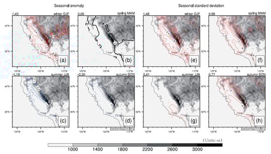 It is worth noting that the analyzed region of California was selected as 32–42° N, 126–114° W for the convenience of research. When calculating the seasonal anomalies, the climatology was based on the time period of 1951–1990 over land and 1979–1998 over oceans, due to the data restrictions.