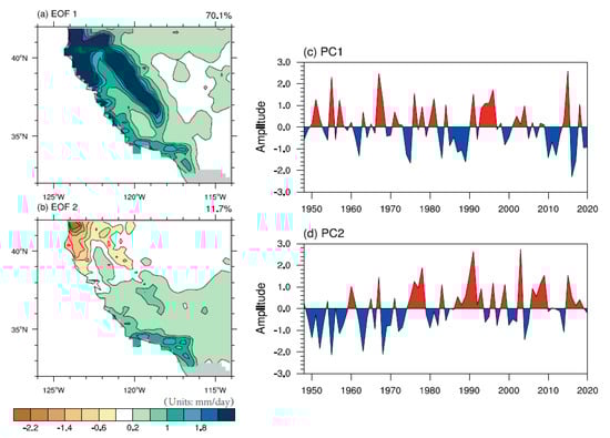 To identify the basic mode of precipitation evolution, empirical orthogonal function (EOF) analysis was applied. Figure 2 shows the leading two patterns and corresponding principal components (PCs). The first EOF pattern (EOF1) denoted a consistent evolution across the whole region. The variance contribution was 70.1%, indicating that the changes in California precipitation were mainly described by consistent changes. It is worth noting that there was seemingly a negative trend in the first principal component (PC1), indicating a general drying of California. In recent years, PC1has become more negative, representing the drought of California, which is consistent with observation. From the second EOF pattern (EOF2), a north–south dipole change in precipitation was shown, with opposite evolution between the north and south. The variance contribution was 11.7%. It is worth mentioning that there was an increasing trend in PC2, which may indicate that the south of California is becoming wetter, while the north is getting drier. The first two leading EOF modes were well separated from each other and the remaining modes, according to the criteria of North et al. (1982) []. Results reveal that these two patterns described two different processes and could be analyzed independently (figure not shown). The combination of EOF1 and EOF2 could explain over 80% of the precipitation change. Therefore, we only discuss the first two leading modes in this study.