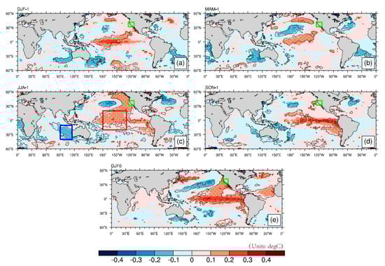 Evolution of SST patterns (°C) regressed to standardized PC1 from the preceding winter (a) to spring (b), summer (c), autumn (d) and the subsequent winter (e). Areas with dots exceed a 90% confidence level. The green box represents the selected California area. Red and blue boxes denote key regions analyzed.