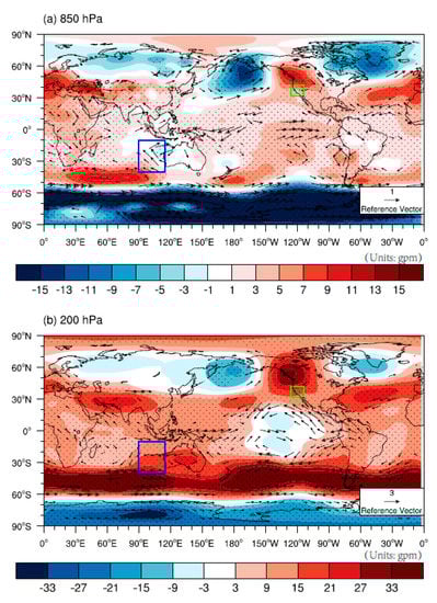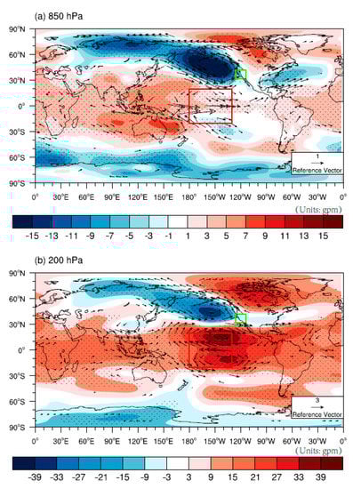 Geopotential height (shading; gpm) and horizontal velocity (vector; m/s) at 850 hPa (a) and 200 hPa (b) in winter regressed to the box-averaged SST (red box). The green box represents the selected California area. Only wind exceeding the 90% confidence level is shown. Areas with dots exceed the 90% confidence level.