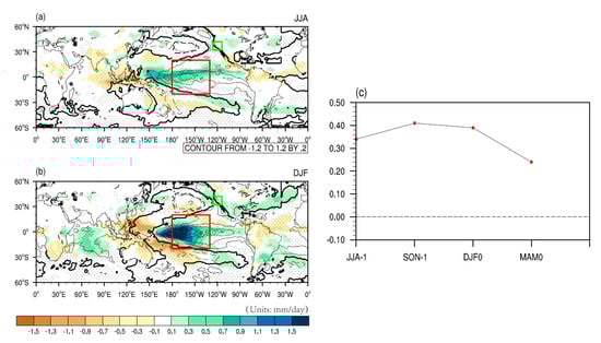 From the above analysis, we can infer that the positive SST in the central Pacific Ocean would cause positive precipitation in California. Next, we address how the signal in the preceding summer affects precipitation in the subsequent winter. We hypothesize that it is attributed to the slow change and persistence of SST. Figure 5 shows the precipitation and SST in the preceding summer and the subsequent winter regressed to index 1. The SST is positive in summer and changes slowly. According to air–sea interaction [], induced by positive SST, the precipitation in the central Pacific is positive, leading to the PNA-like pattern response. Since the change in SST is slow, the SST is also positive in the subsequent winter, which would also cause PNA pattern and positive precipitation in the California region in the subsequent winter.
