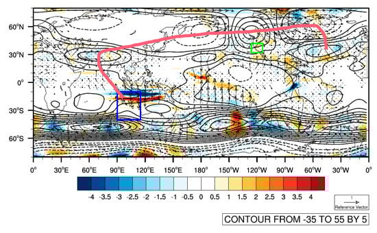 The relationship between SST in the southeast Indian Ocean and precipitation in California was negative. Using a similar method, index 2 was defined as the average SST in the blue box in Figure 3c in the preceding summer. Figure 6 shows the geopotential height and horizontal velocity at 850 hPa and 200 hPa in the concurrent winter regressed to index 2. Regardless of whether the lower level or upper level was considered, the key region was occupied by the significantly high pressure, leading to unfavorable conditions for precipitation and a negative relationship between SST in the Indian Ocean and precipitation in California, consistent with the above analysis. It is worth mentioning that the correlation coefficient between index 1 and index 2 was not significant (0.16), indicating that the Indian Ocean SST is an independent factor and has a negative contribution to California precipitation. Where is the source of the anticyclone? Here, we use wave activity and wave activity flux to describe this []. The definition of wave activity (W) is as follows: