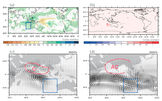 (a) Precipitation (mm/day) in winter regressed to the box-averaged SST (blue box). The green box represents the selected California area. Areas with dots exceed the 90% confidence level. (b) Diabatic heating anomaly pattern introduced into the AGCM experiment. Atmospheric response (m/s) at 850 hPa (c) and 200 hPa (d) in the model. “C” and “AC” represent the anomalous cyclone and anticyclone induced.