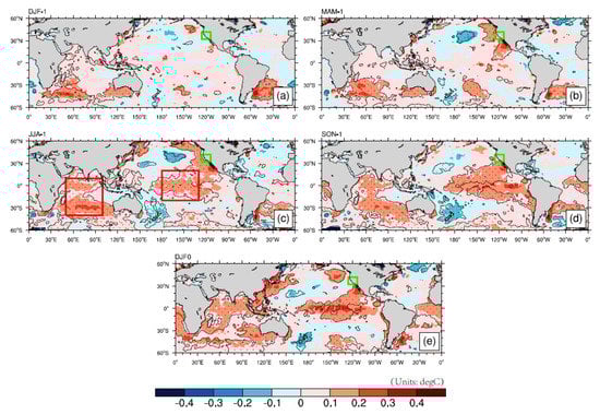 Since EOF1 and EOF2 described two different processes, the changes in PC1 and PC2 were analyzed separately. Figure 3 shows the evolution of SST patterns regressed to PC1 from the preceding winter to the subsequent winter. In both winters, we can see an El Niño-like pattern, which indicates that warm SST in the eastern Pacific Ocean corresponded to positive precipitation in California, consistent with previous studies []. It is worth noting that the positive relationship was continuous from the preceding winter to autumn. As the predictions of drought and flood are often needed one season in advance, and the signal in the preceding summer was most significant, the environmental factors were chosen in the preceding summer, as shown in Figure 3c. There was a positive relationship between SST in the central Pacific Ocean (red box; 20° S–20° N; 180–130° W) and California precipitation, as well as a negative relationship between SST in the southeast Indian Ocean (blue box; 40–10° S; 90–115° E) and California precipitation.