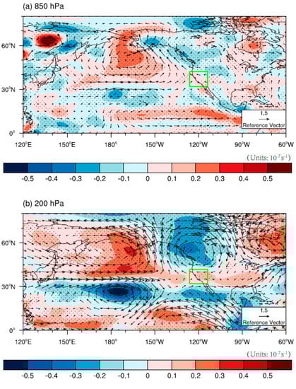 Relative vorticity (shading; 10−7 s−1) and horizontal velocity (vector; m/s) at 850 hPa (a) and 200 hPa (b) in winter regressed to the box-averaged SST (the left red box in Figure 9c). The green box represents the selected California area. Areas with dots exceed the 90% confidence level.