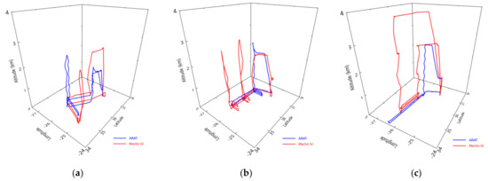 Flight plans: (a) perpendicular axes (approximately 100 km), (b) a long axis (200–300 km) with three perpendicular segments, and (c) one long axis of 300 km. Tracks of ARAT and Merlin IV are depicted in blue and red, respectively.