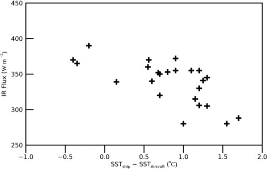 where the left-hand side is the measured radiation at the flight altitude, term II is unknown ( and ), and term III is calculated by a statistical method at different altitudes. In term IV, is measured. When , depends on the vertical variation of . Figure 2 shows the descending IR radiation flux as a function of the SST difference between the ship and the aircraft (), which decreases when the IR flux increases. Assuming that the SST and vary little between the two measurements over the same flight trajectory, is calculated and the corrected SST is estimated.