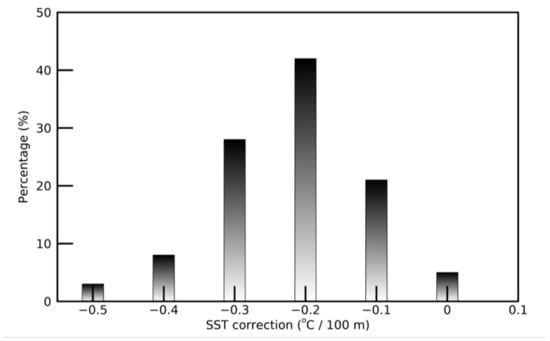 The SST was corrected on each flight track of approximately 30 km. Figure 3 shows the correction rate of the SST, with altitude plotted against the IR flux divergence. According to the measurement of Merlin IV, the major correction rate was 0.25 °C per 100 m, as shown in the histogram for the different applied days.