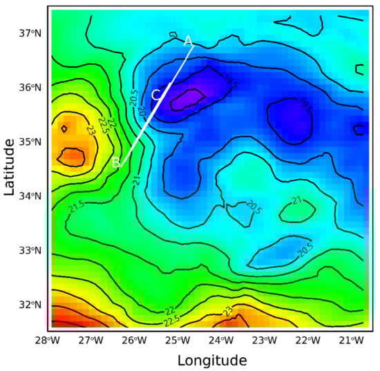 The oceanic circulation at the mesoscale was characterized by the Azores front and influenced by its eddies [28,29]. For November 11, Figure 4 shows the SST field from the ARPEGE analysis and the flight axis with the ship position near point B. The SST field dominated by a large meander was oriented NW–SE in the northwestern part and W–E in the southern part of the experimental domain. All aircraft observations were conducted in the northwestern region of the meander. The SST gradient was increased from point A to point B. The SST minimum was 19.2 °C at 24.8° W–36° N and the maximum temperature recorded was 23.4 °C at 27.5° W–34.8° N. During the IOP, the SST front was quasi-stationary, even though local variations were found in the cold area. The orientation of the SST front changed from 20° to 30° on October 31 and on November 13 with respect to north. A mean gradient of 1–2 °C/100 km continued throughout the IOP, which was significantly lower than those recorded in the FASINEX [7,8].