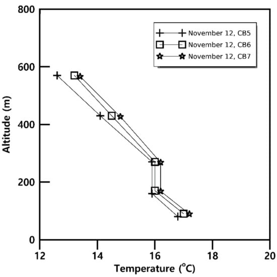 Air temperature was measured using three probes in each of the two aircraft. The mean temperature measured by Merlin IV was 0.5 °C higher than that of ARAT between 950 and 900 hPa. There was no defrosted Rosemount probe, resulting in the intermediate value between the three probes of ARAT. In addition, the difference between the two temperature sensors used as references was approximately 0.7 °C at this altitude [33]. Figure 5 shows vertical profiles of the average temperature measured by the Rosemount probe at a 30 km segment. Adiabatic profiles were found through five levels: the two profiles were lower as measured by the ARAT and the other three profiles were higher as measured by Merlin IV. A difference of 0.7 °C was revealed between the air temperatures measured by the two aircraft. Because the measured static pressures of the two aircraft were coherent, temperature correction was applied to the potential temperature [21].