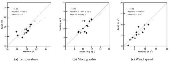 Comparison of (a) temperature, (b) mixing ratio and (c) wind speed measured at 10 m on the ship with aircraft-based measurement.