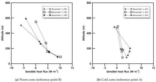 Vertical variations of the sensible heat flux at (a) warm zone and (b) cold zone for six segments on November 1.