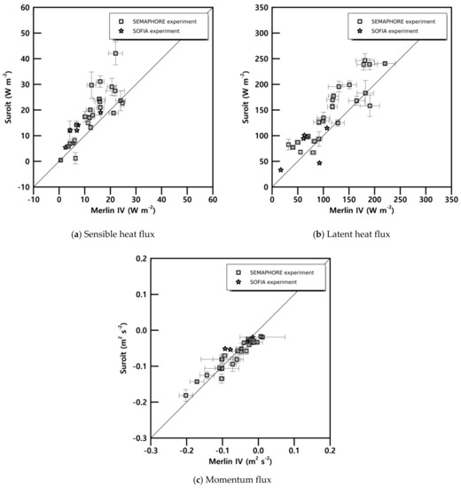 For the measurement of turbulence, the correlation method was implemented by the aircraft and the inertial dissipation method was implemented by the ship [40]. The fluxes were extrapolated to the surface near the ship using a linear regression of airborne flux measurements at four different flight heights (Figure 9). The sensible heat and latent heat fluxes of the aircraft were weaker than those measured on the ship (Figure 10a,b). The sensible heat flux and the latent heat flux was underestimated by 37% and 13%, respectively, by the aircraft. These values are comparable with those evaluated during the first ISLSCP (International Satellite Land Surface Climatology Project) Field Experiment (FIFE) [41]. The low estimate of the sensible heat was influenced by the weak sensible heat fluxes over the ocean. No significant difference was observed in the momentum flux (Figure 10c) with a deviation of dispersion of approximately 30%. During the Hydrological cycle in the Mediterranean Experiment (HyMeX) Special Observing Period 2 field campaign, the turbulence structure of the MABL was analyzed to be localized in the northwestern Mediterranean basin [34]. A comparison between the extrapolated bulk fluxes and surface fluxes computed at a moored buoy revealed considerable differences, mostly with respect to the latent heat flux under strong wind conditions. Because the wind speed was relatively weak in the SEMAPHORE and Studies On Fission with Aladin (SOFIA) experiments [42], the latent heat flux according to the aircraft was less dispersed than the sensible heat flux. In the SEMAPHORE experiment, the temporal segment of the ARPEGE model-based sensible heat flux recorded a bias of −8 W m−2 in comparison with the ship-based sensible heat flux. However, this was not the case for latent heat flux [27].
