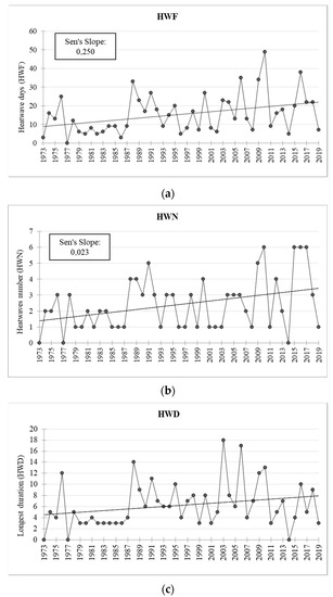 Mann–Kendall test results for HWF (heatwaves days), HWN (heatwaves number), and HWD (longest heatwave duration).