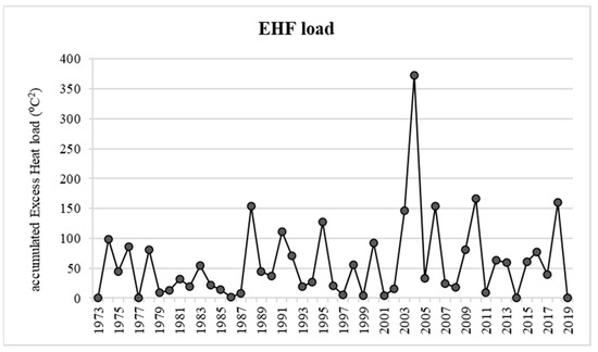 The magnitude of an upward trend in the HWF parameter (number of heatwave days) is the strongest, indicating an increase of 2.5 heatwave days per decade (Figure 3a), while the frequency of heatwave events (HWN) reveals a slower growth (+0.2 heatwaves per decade, Figure 3b). In addition, the duration of the longest heatwave (HWD) increased by 3.1 days over the 47-year period (Figure 3c). The trend of the accumulated heat load (EHF load) is also positive, as would be expected; however, its magnitude is not statistically significant (Figure 4).
