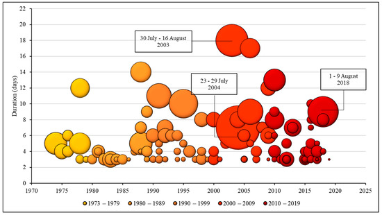 Relationship between heatwaves duration and EHF load (°C2). The size of the bubbles depends on the EHF load of each heatwaves, i.e., the larger their size, the greater the accumulated Excess Heat load.