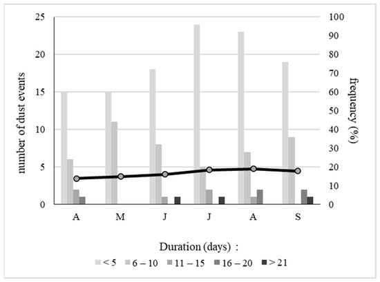 Number of Saharan dust events (SDE) of the hot season (April–September) identified in the study period (2006–2019) and their duration (days). The black line represents the percentage of events occurred at each month in study.