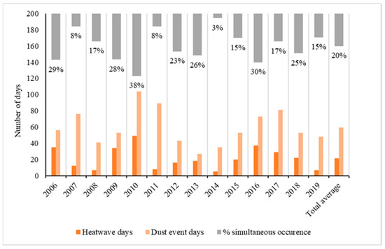 Interannual distribution of heatwaves and SD days and their simultaneous occurrence between 2006 and 2019.