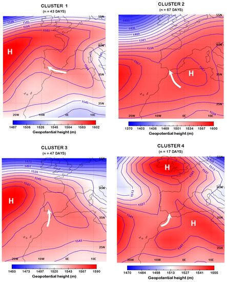 The less frequent pattern (10% of the events) corresponds to Cluster 4. This synoptic type is characterized by the presence of a strong ridge over Western Europe, with two high pressure cores located over the British Islands and northwest Africa (Morocco and Algeria). The position of this great ridge assures the influence of a southerly circulation over southern Portugal, apparently responsible for warm airmass advection (heatwave conditions) and Saharan dust transport.