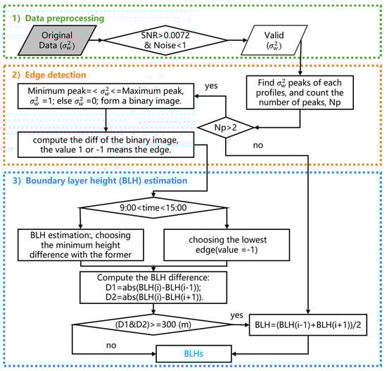 The traditional variance and peak methods for estimating BLH are based on [8,20,21]. On the one hand, the variance method defines the turbulence region as the part beyond the given variance threshold and has been successfully proven to be widely applicable for estimating BLH [8,22,23]. However, the variance threshold is defined based on daytime data, whereas nighttime data are usually below the threshold, thereby making this method inapplicable at nighttime conditions. In addition, the threshold depends on the atmospheric conditions and varies across regions [8,12,21]. On the other hand, the peak method eliminates the subjective effect of the aforementioned threshold and automatically retrieves BLH [24]. This method can also perform well in estimating BLH under conditions where the BLH region shows significant gradient changes. However, the peak method requires an original threshold to filter the effect of high clouds or noise. Determining this threshold depends on atmospheric conditions, and the peak method is limited to only one original threshold. BLH refers to the level where turbulence rapidly decreases and where an obvious gradient change can be detected. Such gradient changes can be identified using edge detection (ED), a digital image processing method [25] that has been widely used in many fields [24,25]. Therefore, to address the limitations of traditional methods, this study introduces ED in BLH estimation based on . The turbulence area was considered as the points between the maximum and minimum peaks of the data profile, and then BLH from the edge of turbulence was identified based on the theory of the diurnal cycle. Finding these edges based on data eliminates the influence of changes in atmospheric conditions. The wavelet covariance transform (WCT) method was widely used to estimate the BLHs based on aerosol lidar and performed well [7,18,26]. Therefore, the WCT method and the ED method were compared with RS measurements, respectively. The results were compared and analyzed.
