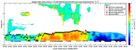 The recorded on 4 March 2019 was used to estimate the BLHs via the variance, peak, and ED methods, and the estimated BLHs were then compared with the corresponding RS measurements shown in Figure 4. The red triangle represents the BLHs obtained using RS, and the color gradient represents the DL . The purple x, red cross, and black circle represent the BLHs derived from the variance, peak, and ED methods, respectively. Most of the BLHs obtained using the variance method were overestimated and had a chaotic distribution. Meanwhile, many of the BLHs obtained using the peak method were empty, and a few BLHs were overestimated. The BLHs obtained using ED were stable and were highly consistent with the RS measurements.