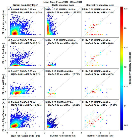 Data from 2018 to 2020 were used to verify the consistency of the three methods with RS under NBL, SBL, and CBL, respectively, as shown in Figure 6. A redder color corresponds to denser dots and more BLHs. The black dotted line represents the reference line with a slope of 1. On the NBL, SBL, and CBL, the R obtained by ED was larger than those obtained by the variance and peak methods (R: 0.4 vs. 0.05, 0.14; 0.26 vs. −0.10, −0.16; 0.35 vs. 0.01, 0.16). Meanwhile, the RMSE obtained by ED was smaller than those obtained by the variance and peak methods (RMSE: 0.58 km vs. 0.82 km, 0.82 km; 0.37 km vs. 1.01 km, 0.5 km; 0.66 km vs. 0.98 km, 0.90 km). The mean absolute error (MAE) of the ED method under the NBL, SBL, and CBL conditions are lower than the variance and peak methods (MAE: 0.44, 0.14, 0.50 vs. 0.62, 0.34, 0.64; 0.59, 0.75, 0.74), respectively. The mean relative error (MRE) of the ED method is lower than the variance and peak methods under the CBL condition (MRE: −8.88% vs. −18.39%, 13.91%). Under the SBL, the MRE of the ED method is lower than the variance method and higher than the peak method (−38.64%, vs. −152.23%; 14.02%), respectively. Under the CBL, the MRE of the ED method is lower than the variance method and higher than the peak method (−15.07% vs. 2.24%; 5.64%), respectively. In addition, more BLHs (points at which color change from deep red to shallow blue) derived from the ED method are close to the reference line than those derived from the variance and peak methods. The lower MRE of the ED method makes its result reliable. In conclusion, the result of the ED method is more consistent with the variance and peak methods under the same conditions. Although, the R of these methods were all low.