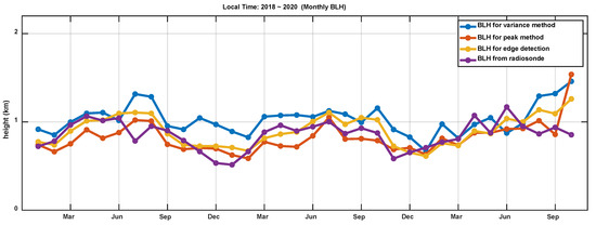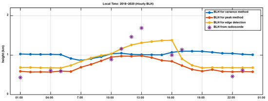 The hourly average BLHs are shown in Figure 7. The blue, orange, and yellow point lines represent the mean BLHs per hour in 2019 retrieved using the variance, peak, and ED methods, respectively. The purple asterisk represents the RS measurements for each hourly BLH.