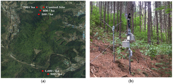 The study was conducted in Pinus koraiensis Siebold et Zucc. forests of Gwangneung Experimental Forest, managed by National Forest Research Institute located in Pocheon, Gyeonggi-do, South Korea. The geographical locations of the study sites are 37°47′12.786″ N, 127°11′21.0876″ E, and they are located at 150 m to 170 m above sea level. Gwangneung Experimental Forest has a total area of 1072 ha, of which 515 ha of the coniferous forest, including P. koraiensis forests, accounts for 48% of the total area. Gwangneung Experimental Forest was designated as a UNESCO (United Nations Educational, Scientific and Cultural Organization) Biosphere Reserve in 2010 and is recognized worldwide for its importance [61]. In addition, Gwangneung Experimental Forest is home to more than a thousand species of plants and over 3000 species of animals [62]. In this study, the research was conducted on five experimental areas with 500, 600, 700, 900, and 1000 tree counts per hectare of P. koraiensis forests, and control areas with zero tree counts per hectare outside the research site (Figure 1). The study sites, including the control site, 500/ha, 600/ha, and 700/ha, are located within 100 m of the center of the 600/ha site, while the 900/ha and 1000/ha study sites are located within 100 m of each other. The distance between the 500/ha site and the 1000/ha site is about 2 km. The average age of P. koraiensis trees in the site were 31 to 40 years, with an average diameter at breast height of 27 cm and an average height of 21 m. In addition, dominant wind directions in the study sites during the study period were south-southeast (700/ha, 900/ha, and 1000/ha), south (0/ha and 600/ha), and south-southwest (500/ha).