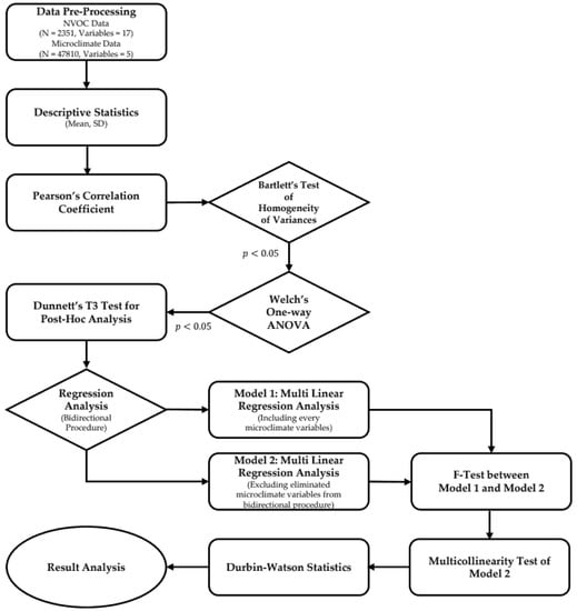 Finally, multiple regression analysis using the bidirectional procedure method was conducted to investigate the effects of microclimate factors on phytoncide emissions by forest density, and a phytoncide emission prediction equation was formulated using microclimate factors by forest density. It is also expected that the general public will be easily able to calculate the amount of phytoncide emissions of the selected study site with forest density that can maximize the forest healing effects. Multiple regression analyses were performed for each forest density, totaling six times. Model 1, a regression analysis containing all five microclimate factors, and Model 2, a regression analysis conducted by selecting only significant microclimate factors through bidirectional procedures, were established, and F-tests were conducted to determine whether microclimate factors removed from Model 2 had statistically significant effects. Multicollinearity tests were also conducted to determine the correlation between independent variables in Model 2, and finally, Durbin–Watson statistics were performed to verify autocorrelation. Based on the regression results validated in this way, we establish a final regression equation by forest density.